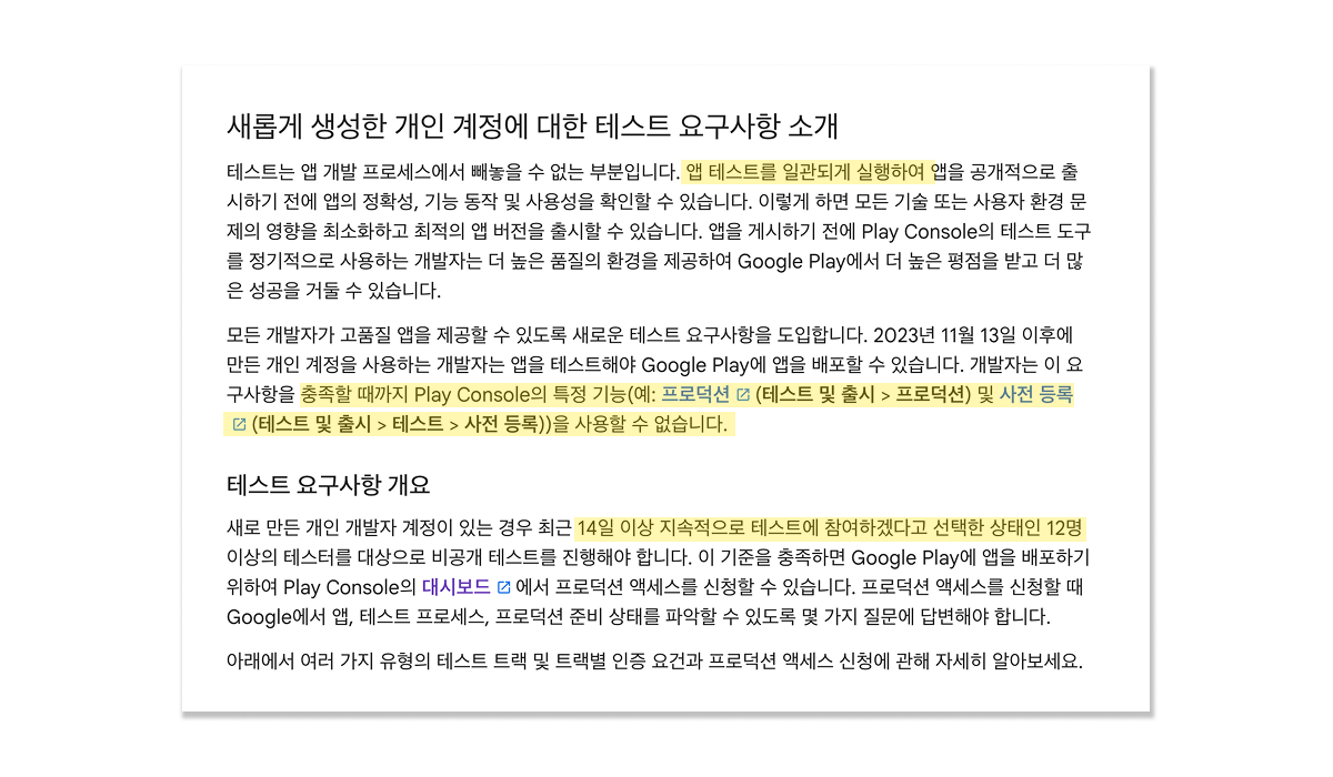 다만 구글에는 개인 개발자에게는 가혹한(?) 출시 전 요구사항이 있었다. 2023년 11월 이후 만들어진 Google Play 신규 개발자 계정의 경우 "14일간 12명 이상"의 비공개 테스트가 필수였다.